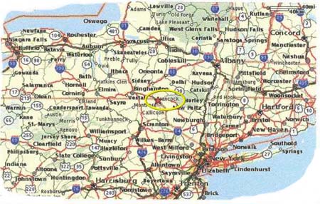 Jersey (2 1/2 hrs) Take Rt. 17W toward Binghamton to Hancock at Exit 87a. From Boston & NE (3-6 hrs) Take Rt. 84S to 17W in New York State to Hancock at Exit 87a or Exit 87. From Scranton (1 hr) Take Rt. 81N to Rt. 374 (Elk Mountain - exit 63). Take Rt. 374E to Rt. 171N. Take Rt. 171N to Rt. 370E to Rt. 191N and follow until you see the bridge going into Hancock, NY (about 1/2 mi). From Philadelphia area (3 hrs) Take N.E. ext. of PA Turnpike to Rt. 81 above Scranton, PA. Follow directions from Scranton above. From Central or Western PA Take Rt. 80E to 81N to Scranton. Follow directions from Scranton above. From Baltimore/Washington DC area (4-5 hrs) Take I-95 to Rt. 476 in Philadelphia to N.E ext. of PA Turnpike to Rt. 81N at Scranton. Follow directions from Scranton.
